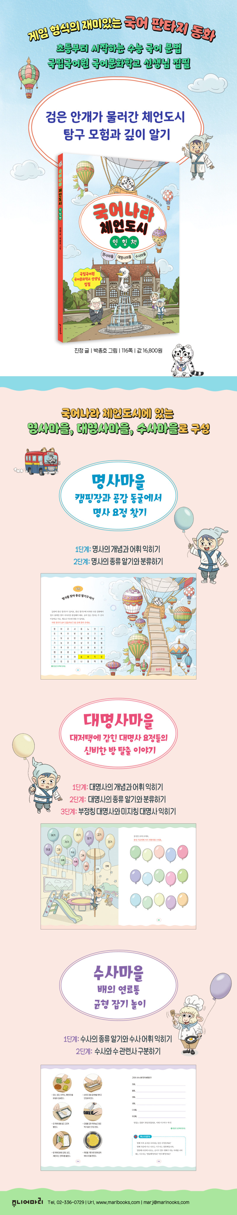 구체 명사와 추상 명사 구분하기, 고유 명사와 보통 명사 나누기 같은 명사의 개념과 종류, 분류더 더욱 명확하게 알 수 있어요. 특히 6장 대극장에서 감정 명사 요정들이 펼치는 ‘공감 동굴’ 이야기에서는 ‘기쁨’ ‘불안’ 등의 감정 명사 요정들이 자신의 이야기를 너무도 공감 가게 펼쳐요. 사진을 보고 맞히는 ‘세계 문화 유산 이름’과 ‘위인 이름’ 퀴즈도 손에 땀을 쥐게 한답니다.